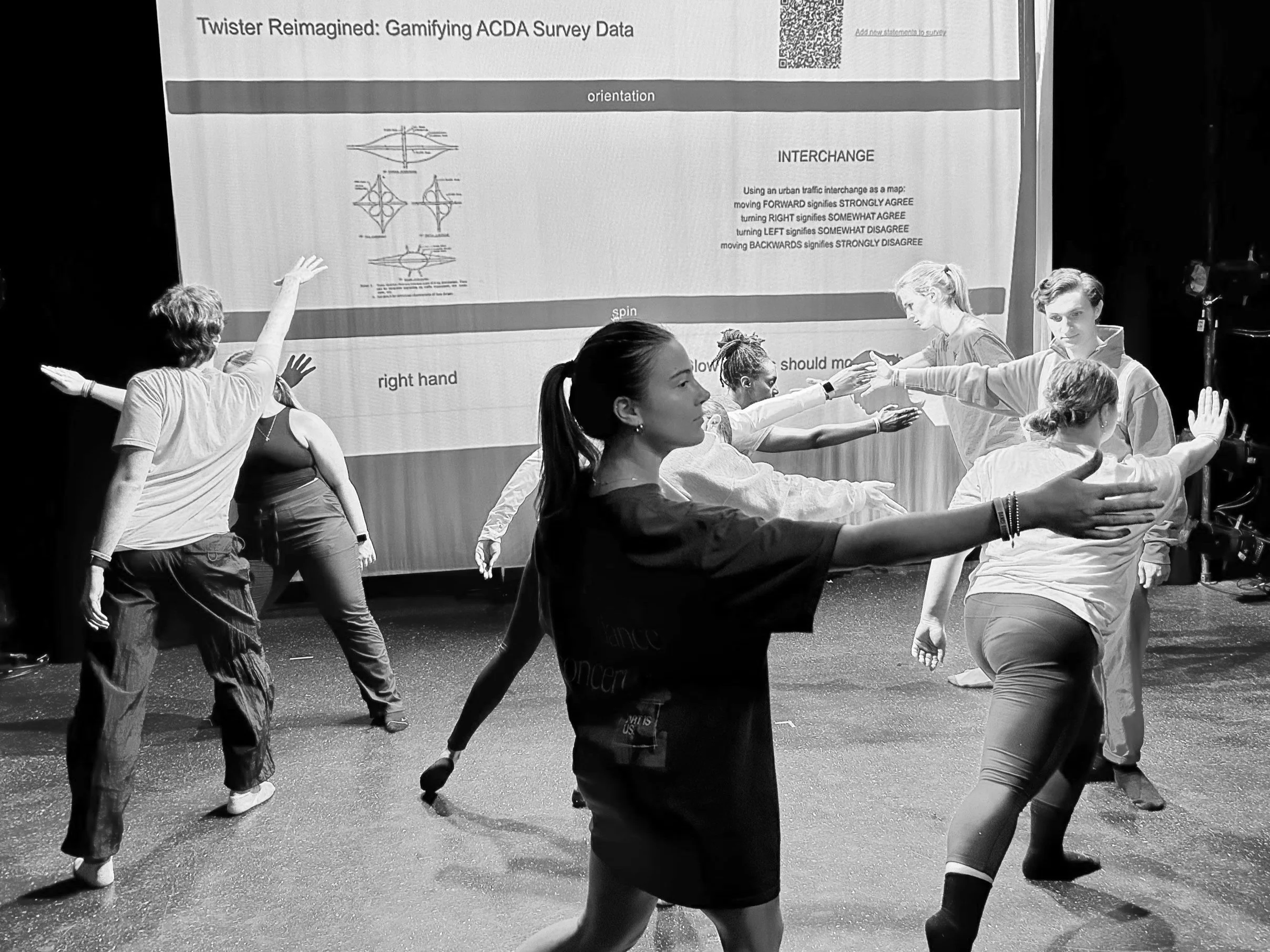 During the four-day series, graduate students at the School of Theatre, Dance, and Performance Studies at the University of Maryland, College Park experimented with applying design concepts from the areas of human-computer interaction, data visualization, and participatory art to their choreographic process. As part of the learning experience, we "workshopped" the dance games from The Data Twist